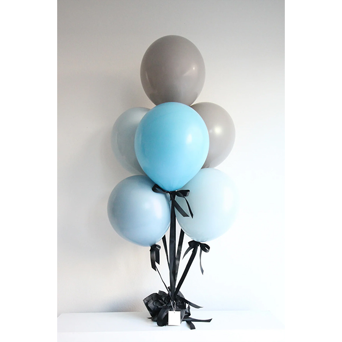 Step up your celebration with Blue Steel, a contemporary AIR BALLOONS STAND featuring a cool mix of blues and grey, tied together with striking black ribbons. Designed for those who appreciate bold yet classic styling, this bouquet is perfect for adding a touch of effortless cool to any event.
